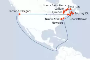 Itinerario : Nueva York, Portland (Oregon), Saint John, Islas de la Madeleine, Havre Saint Pierre, Baie-Comeau, Quebec, |La baie, Siete Islas, Sidney, Halifax, Nueva York, Miami