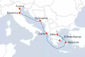 Itinerario : El Pireo Atenas, Volos, Mykonos, Corfú, Dubrovnik, Ravenna, Fusina