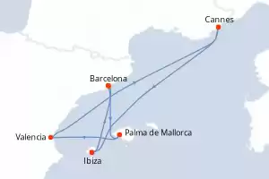 Itinerario : Barcelona, Palma de Mallorca, Valencia, Cannes, Ibiza, Barcelona