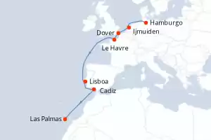 Itinerario : Hamburgo, Ijmuiden, Dover, Le Havre, Lisboa, Cadiz, Las Palmas