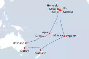 Itinerario : Auckland, Papeete, Moorea, Hilo, Kona, Kauai, Honolulu, Kahului, Apia, Suva, Brisbane, Sidney
