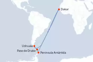 Itinerario : Ushuaia, Paso de Drake, Peninsula Antártida, Dakar, Ushuaia