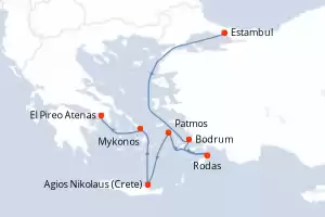 Itinerario : Estambul, Bodrum, Rodas, Patmos, Agios Nikolaus (Crete), Mykonos, El Pireo Atenas