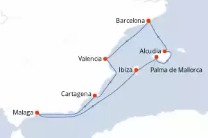 Itinerario : Barcelona, Valencia, Cartagena, Malaga, Ibiza, Palma de Mallorca, Alcudia, Barcelona